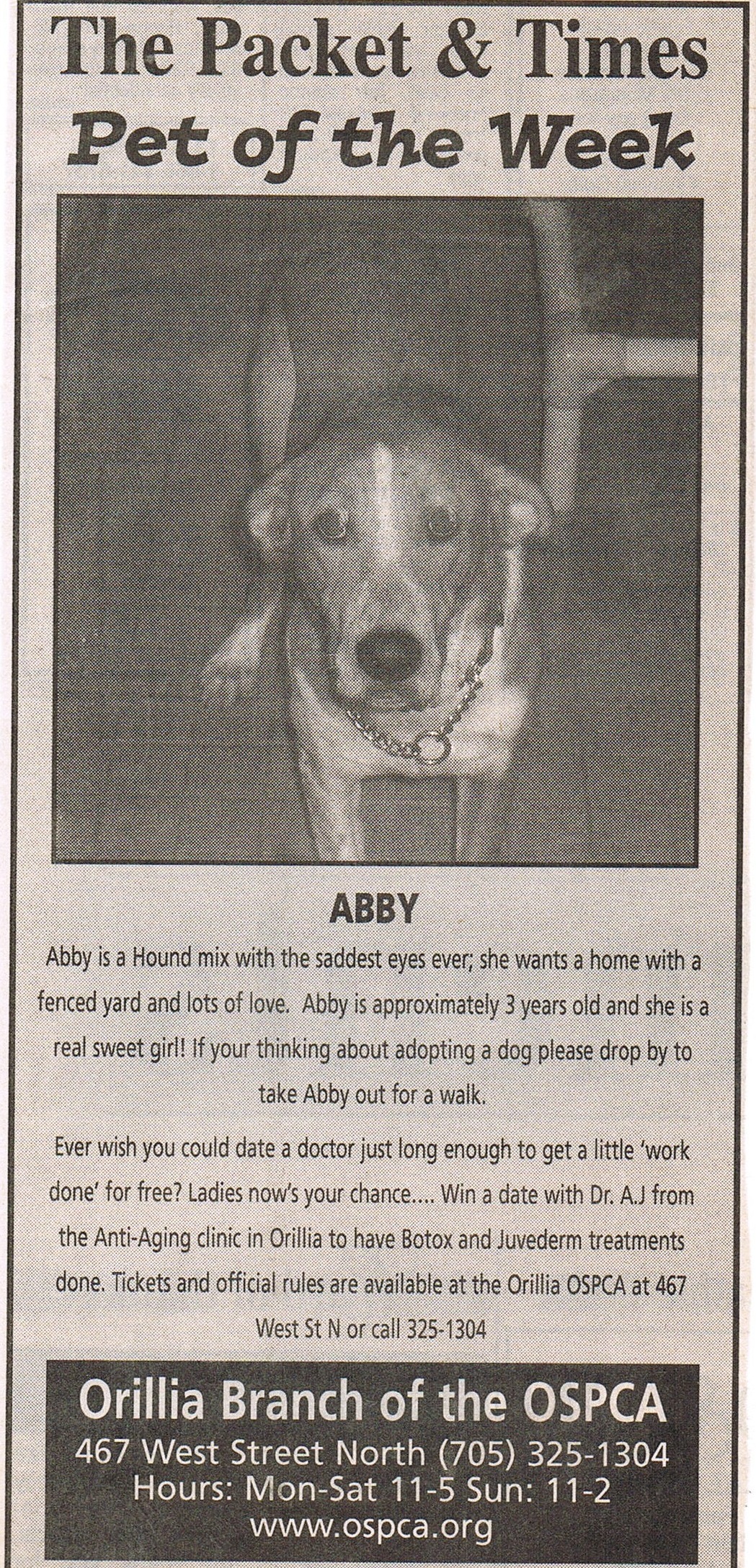 2007-Win a Date with Dr.A.J– We designed and held another unique fundraising event this time with all proceeds going to benefit the Orillia O.S.P.C.A. This campaign was also usefull in introducing our new Medical Director Dr. A.J. Titled “Win a date with Dr.A.J” we offered one lucky winner an unlimited make-over with all proceeds donated in full to the O.S.P.C.A.