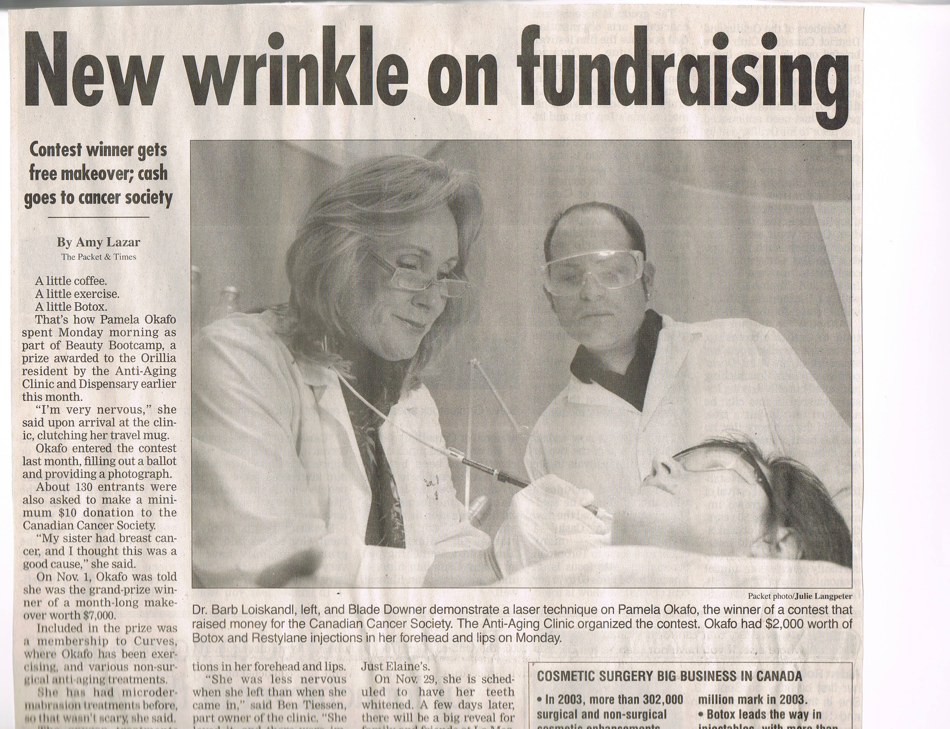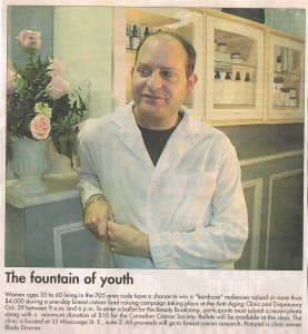 2005-Beauty Bootcamp- We designed and held a unique fundraising campaign with all proceeds donated to the Canadian Cancer Society (Orillia Division) The campaign was available to any woman living in the 705 area code and offered the winner a: $6000.00 make-over including, Botox and Juvederm injections, Microdermabrasion and ultrasound skin resurfacing, non-surgical face lifting as well as donations from local downtown Orillia merchants such as Just Elaine’s, La Mezzaluna Cafe, Curves, Sixty One, TNT Fine Lingerie Boutique, Mariposa Market Stores, Becker Shoes, as well as Laser Health Works and Dr. Max Neiman & Associates.